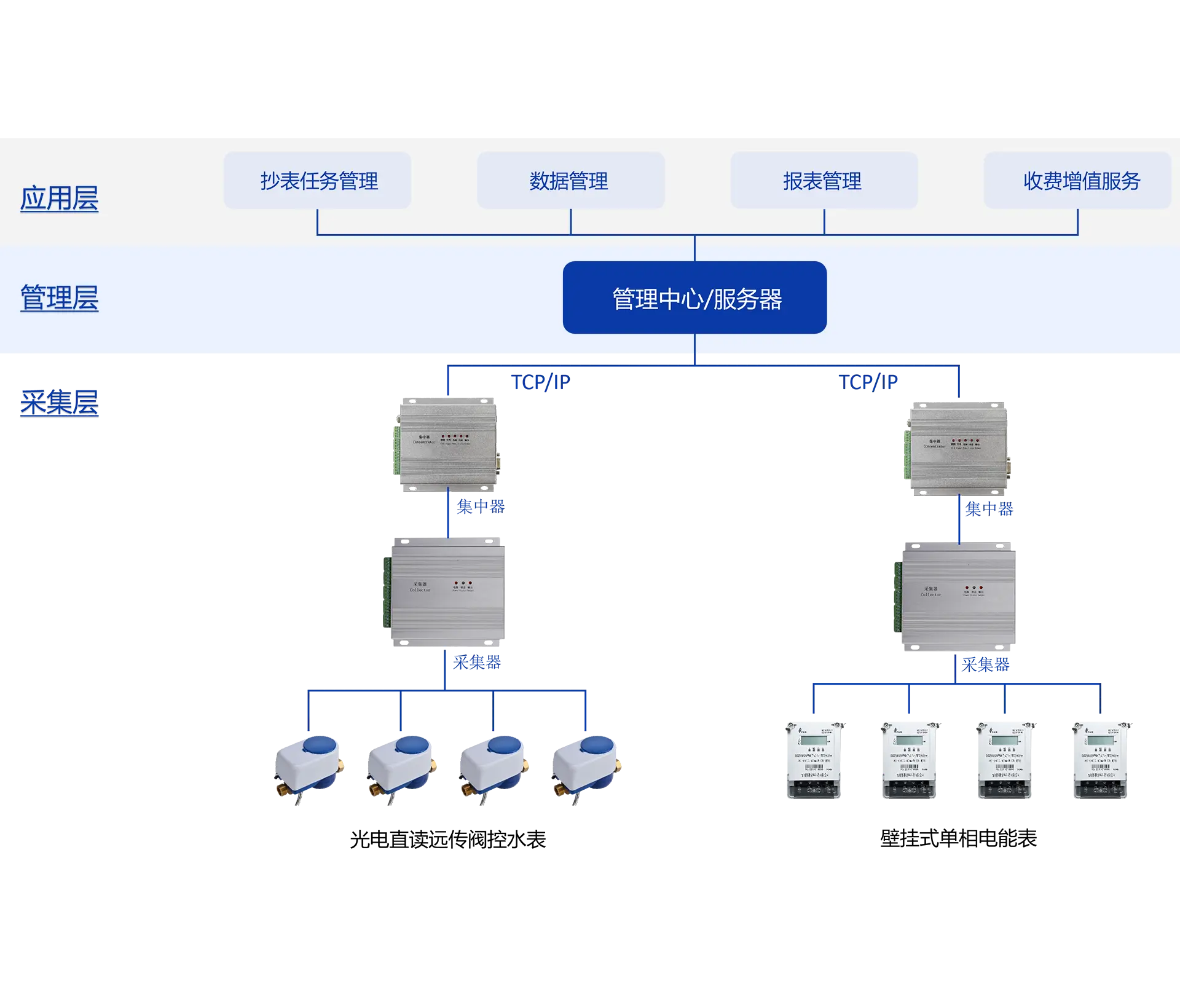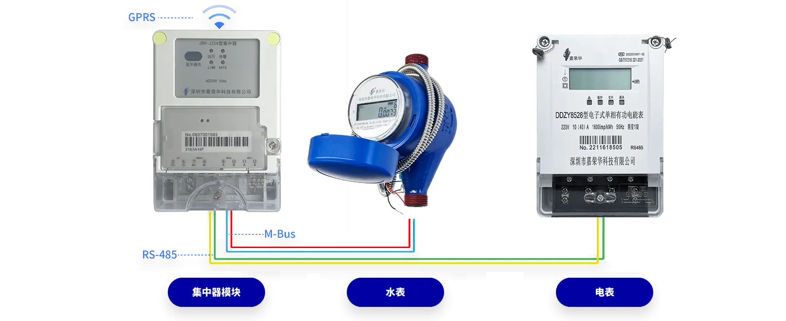 RS-485/M-Bus远传水电表通过集中器将数据转为GPRS/4G信号,实现远程自动抄表。